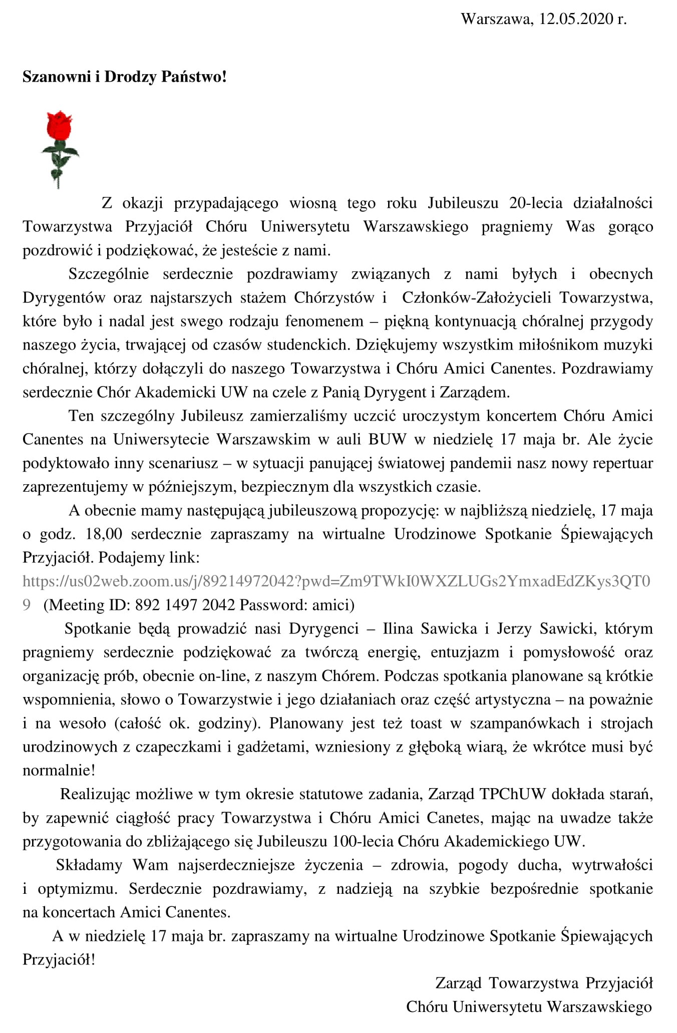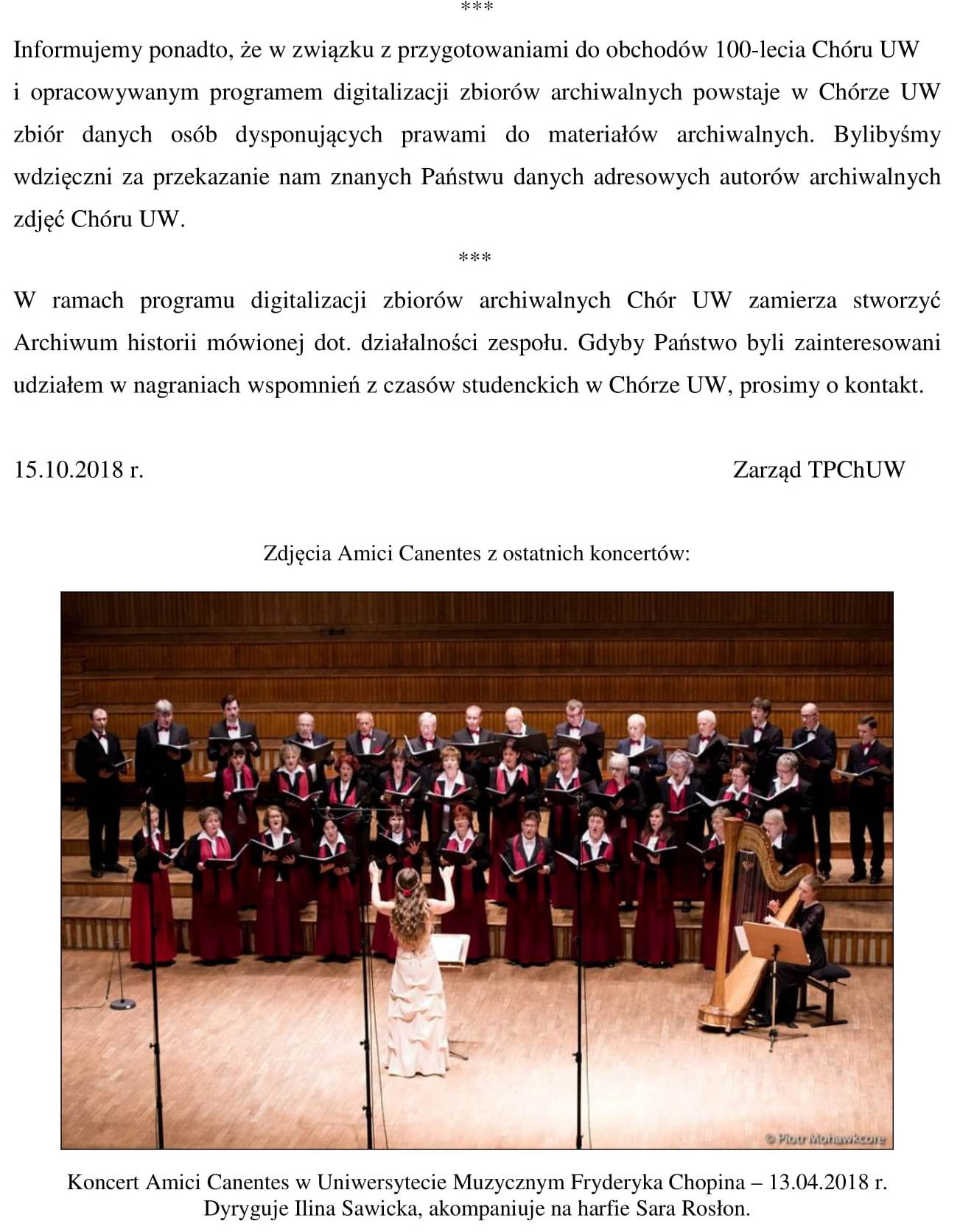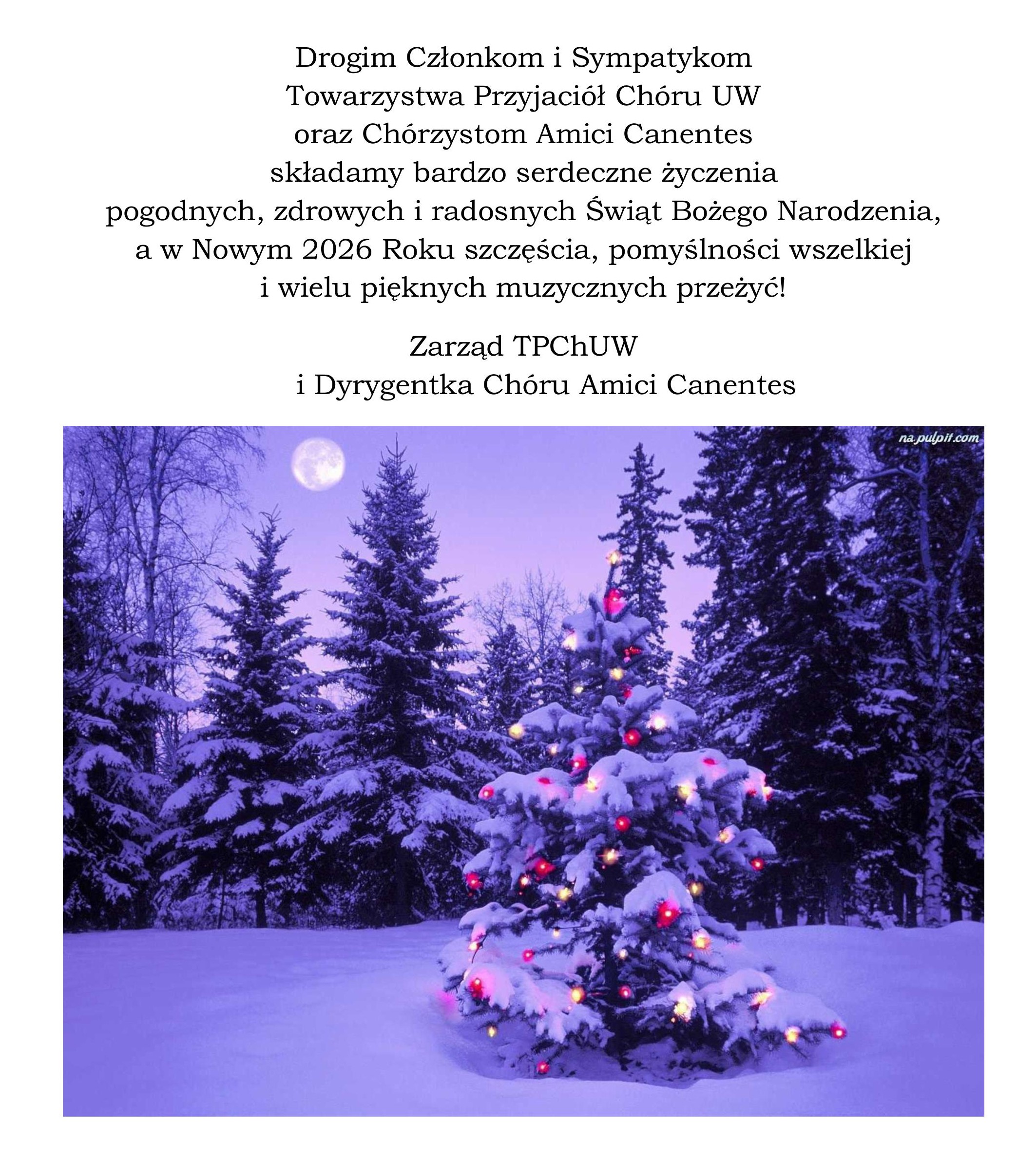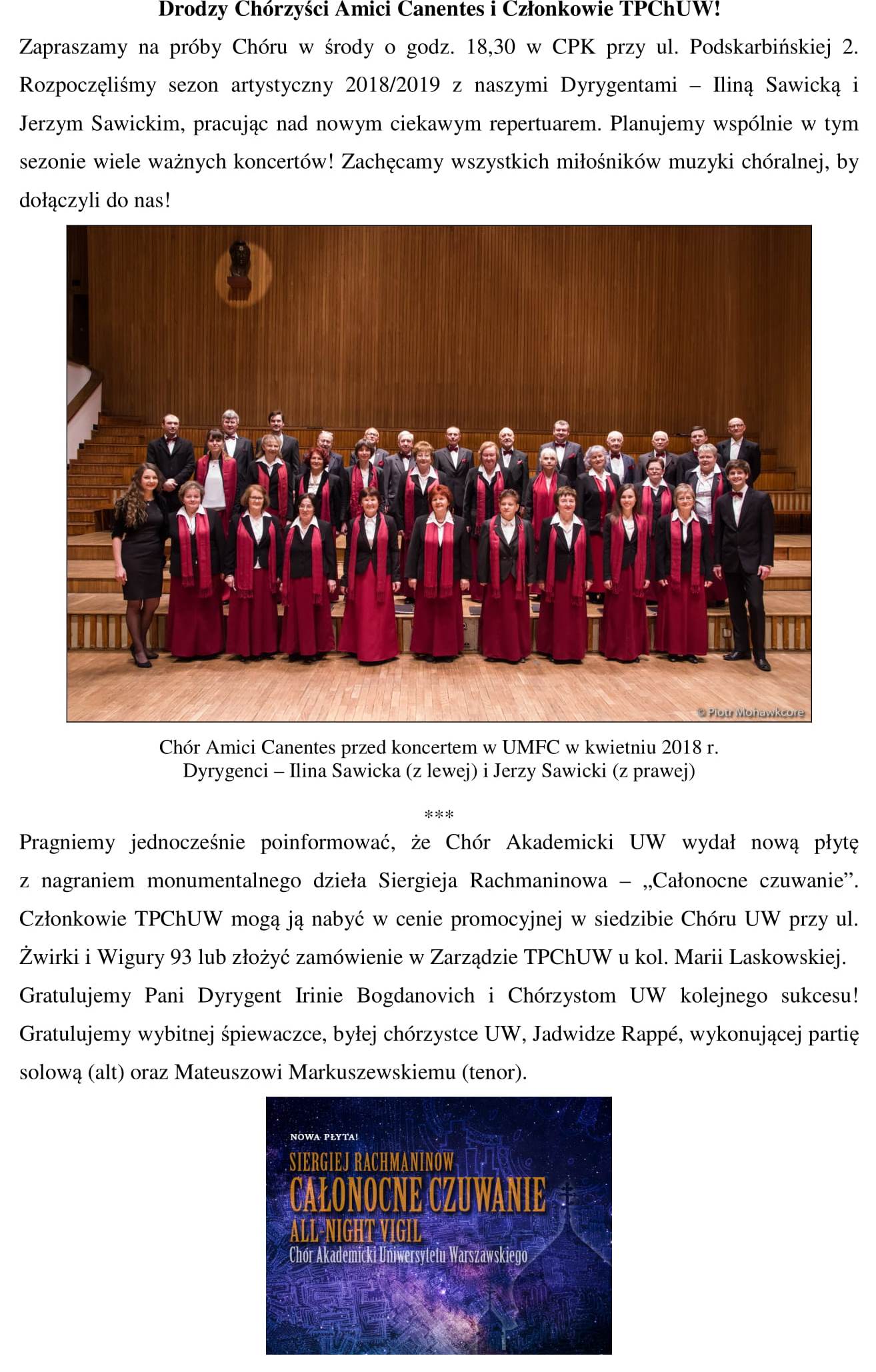 Szanowni Państwo, Drodzy Przyjaciele, Członkowie Towarzystwa Przyjaciół Chóru Akademickiego UW,