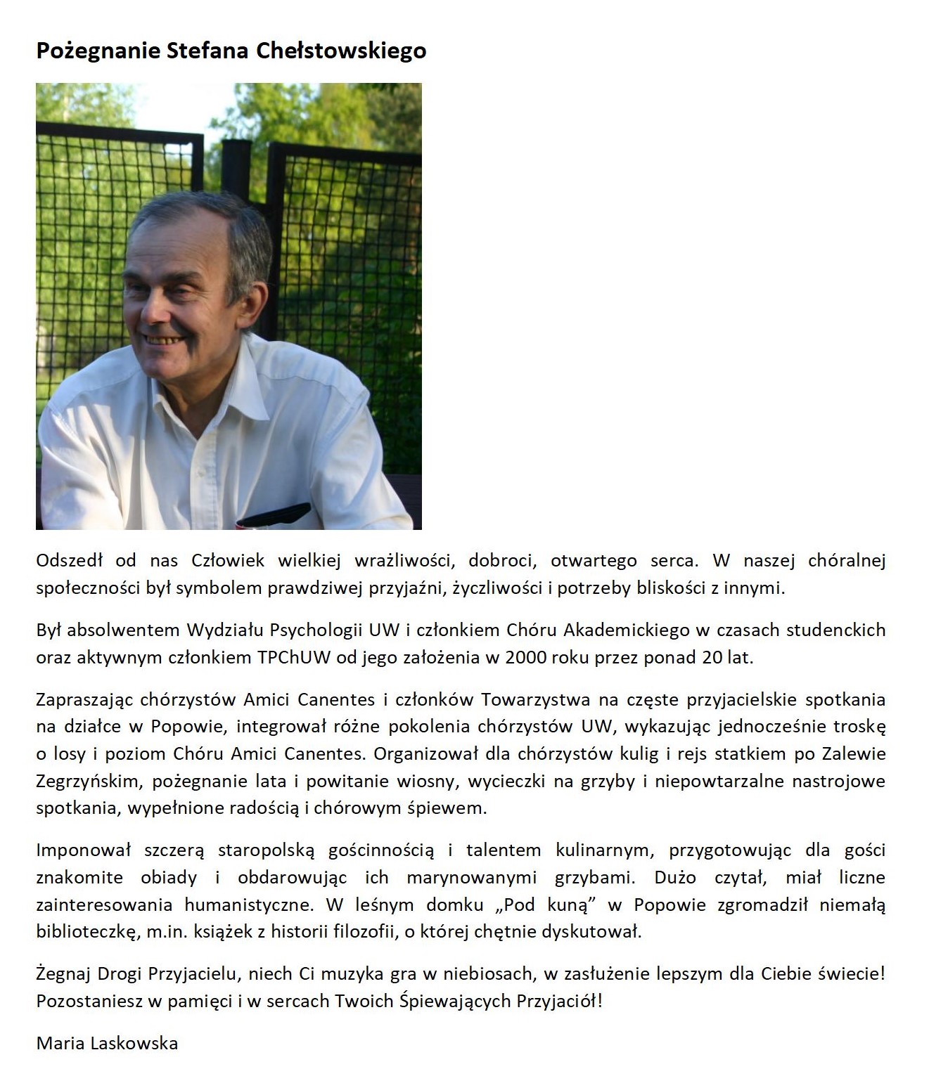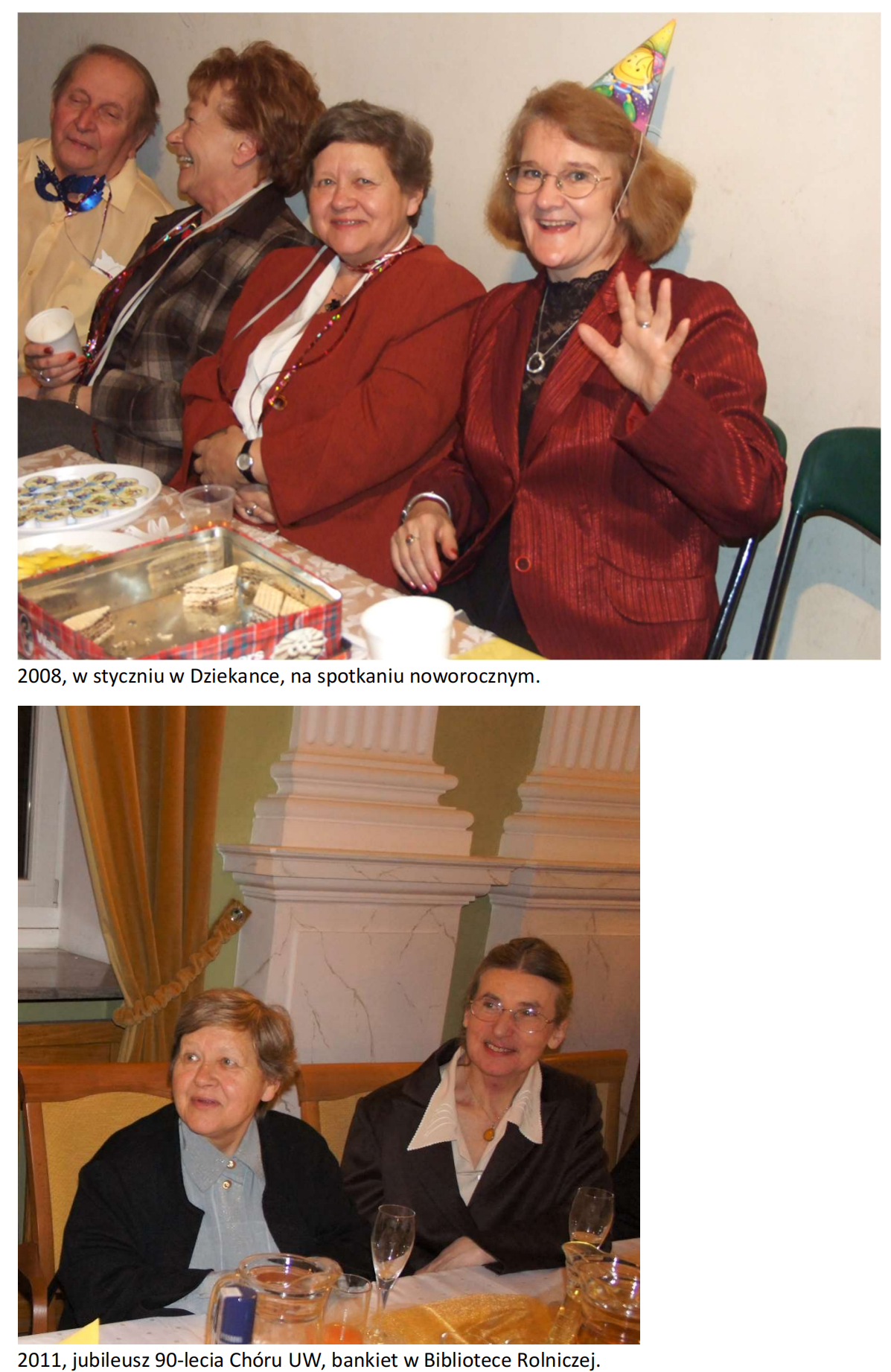 Z chórem nie zerwała kontaktów do końca życia. To był jej żywioł, i, jak mówiła, najsilniejsze kontakty osobiste utrzymywała przez długie lata właśnie z byłymi chórzystami. Ta pasja i to zaangażowanie sprawiło, że w roku 2000 stała się jedną z założycielek, a potem wieloletnią prezeską Towarzystwa Przyjaciół Chóru Uniwersytetu Warszawskiego. Z uwagi na zasługi jakie wniosła swoją działalnością, gdy już sił brakowało do intensywnej pracy, otrzymała tytuł członka honorowego, który nadal jej przysługuje.