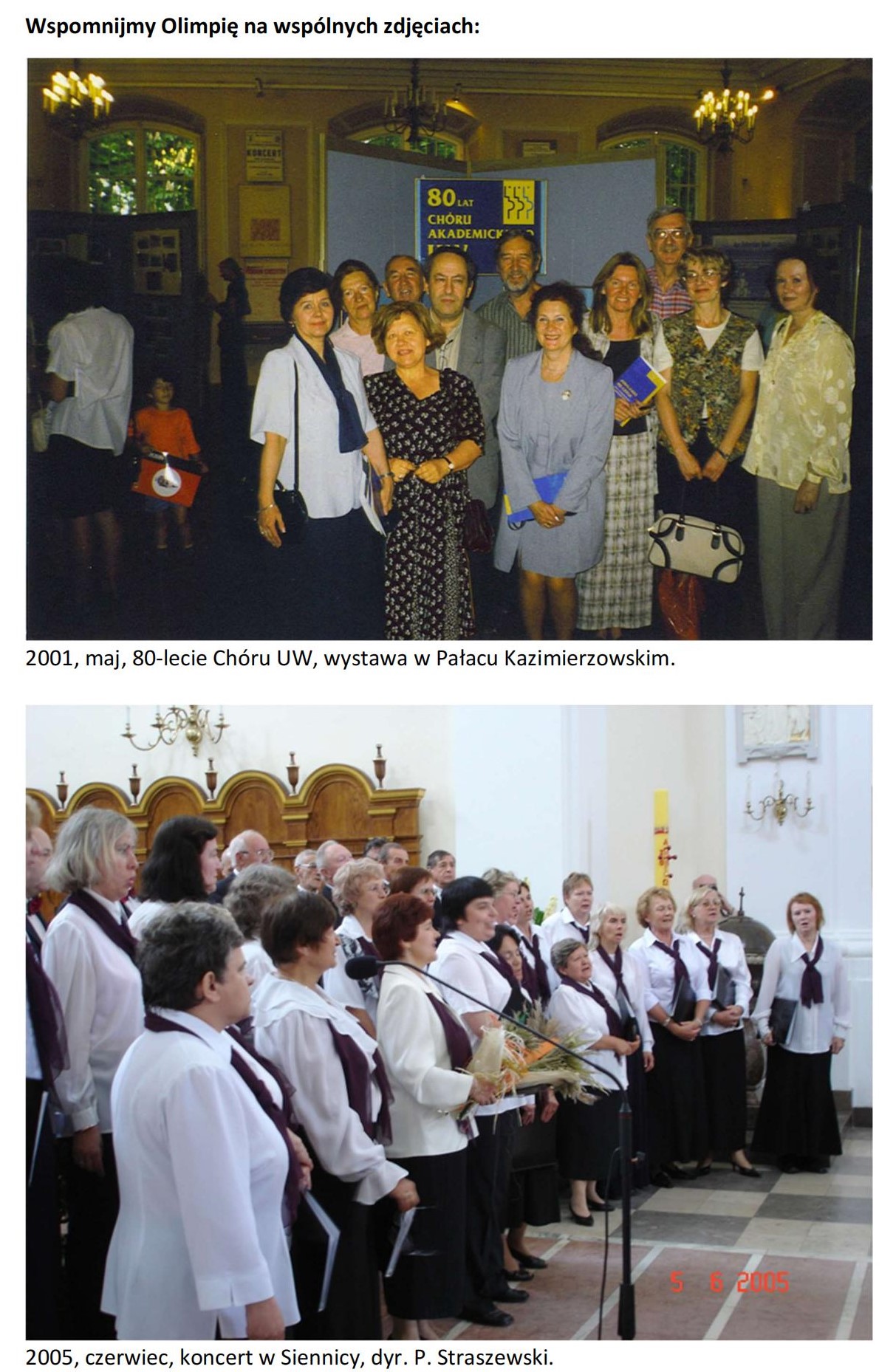 Oczywiście, emerytura nie oznaczała dla Olimpii koniec pracy. Wspomniałam już o ogromnej zasłudze jaką położyła, na przełomie lat 90-tych, w zorganizowanie Towarzystwa Przyjaciół Chóru Uniwersytetu Warszawskiego i jej osobisty wkład w obchody 80-lecia istnienia Chóru UW.