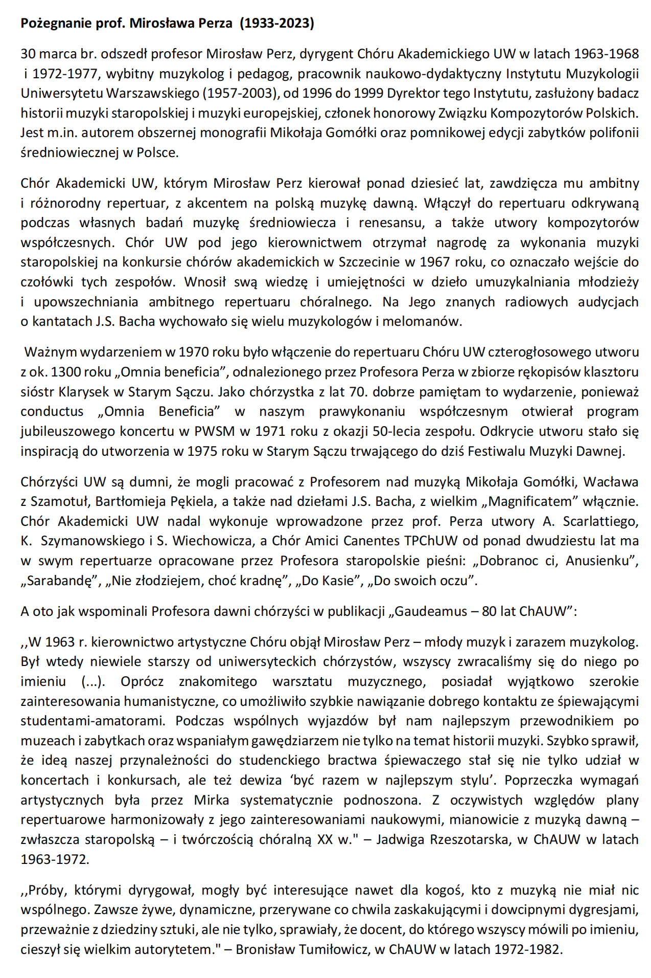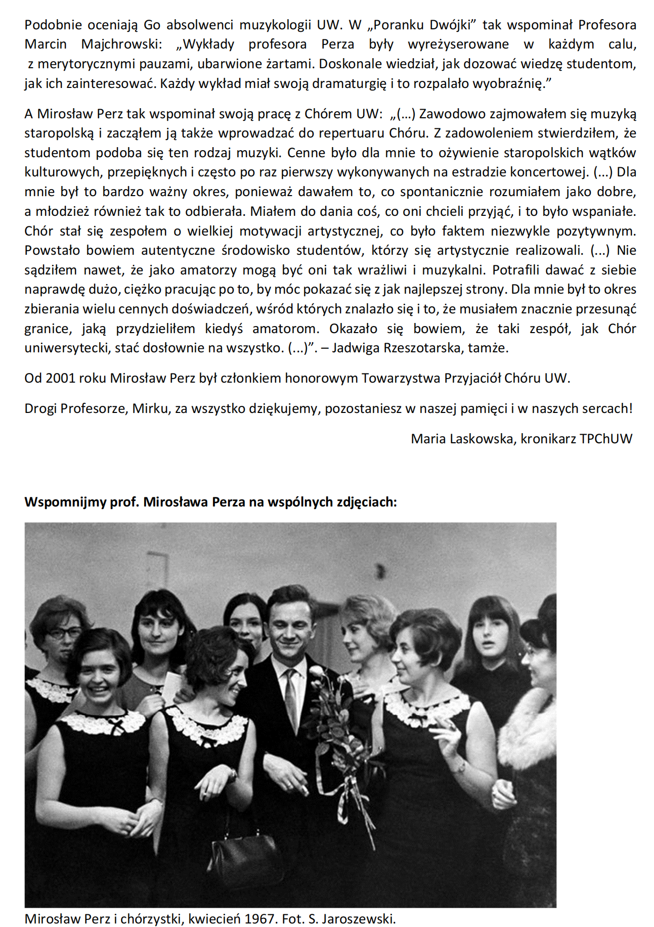 Podczas uroczystości pogrzebowej w Poznaniu pożegnali Śp. Prof. Mirosława Perza m.in. przedstawiciele Instytutu Muzykologii UW i Towarzystwa Przyjaciół Chóru UW.