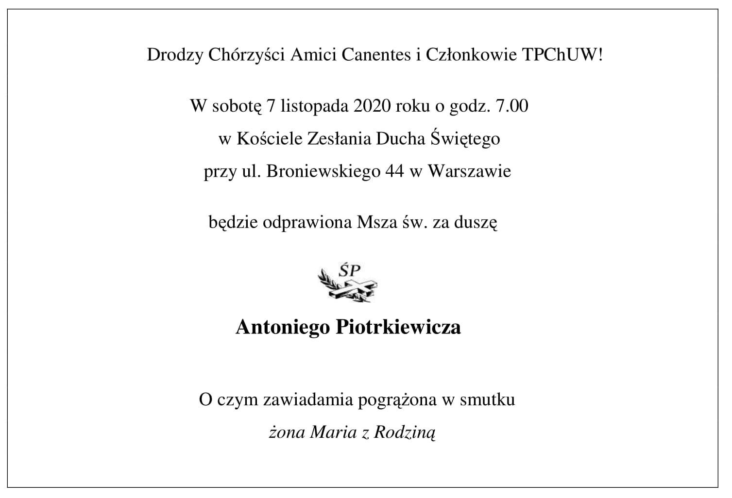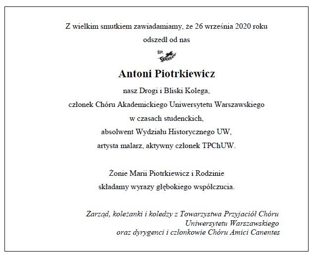 Dla nas, chórzystów i członków TPChUW, był nie tylko utalentowanym artystą malarzem, którego obrazy mogliśmy podziwiać na licznych wystawach, ale także ciepłym, serdecznym Kolegą i Przyjacielem, zawsze aktywnie wspierającym działania Towarzystwa. Wspólnie z żoną Masią byli autorami projektów jubileuszowych wystaw z okazji 80-lecia Chóru UW oraz folderu TPChUW z okazji 10-lecia działalności.