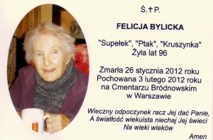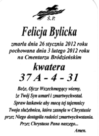 W piątek 3 lutego 2012 roku, o godzinie 12:40 odbyła się Msza Św. pogrzebowa za panią Felicję Bylicką. Rodzina, Przyjaciele i Znajomi oraz grupa chórzystów z Amici Canentes wypełnili drewniany kościół na Cmentarzu Bródnowskim. Młody Chór UW zaśpiewał na mszy dwa utwory.