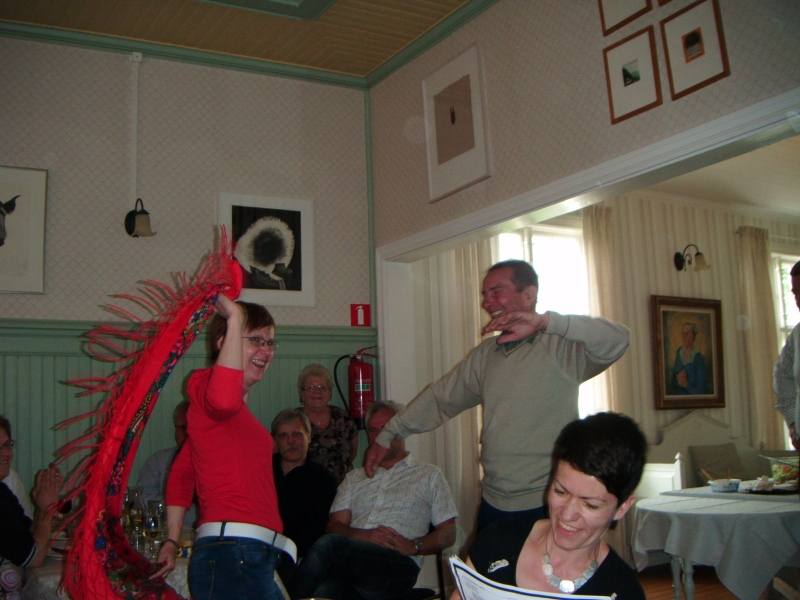 Staraliśmy się wypaść jak najlepiej. Wszyscy byliśmy bardzo wzruszeni. Oczywiście mamy wspólne zdjęcie w pięknej scenerii przed kościołem. Dzień zakończył się uroczystą kolacją, której główne danie stanowił lokalny przysmak w kształcie artystycznie przystrojonego tortu. Składniki tego tortu to krewetki, owoce morza, łosoś, dużo majonezu z jogurtem i inne nieznane mi delicje. Większości z nas bardzo smakował, niektórzy brali dokładki. Śpiewy, toasty, życzenia, podziękowania. Oczywiście zaprosiliśmy naszych uroczych gospodarzy, aby ponownie przyjechali do Polski. Z okrzykami "do zobaczenia w przyszłym roku" rozstaliśmy się w świetnych nastrojach. Do hotelu zostaliśmy odwiezieni prywatnymi samochodami, co dało okazję do nawiązania jeszcze ściślejszej przyjaźni.