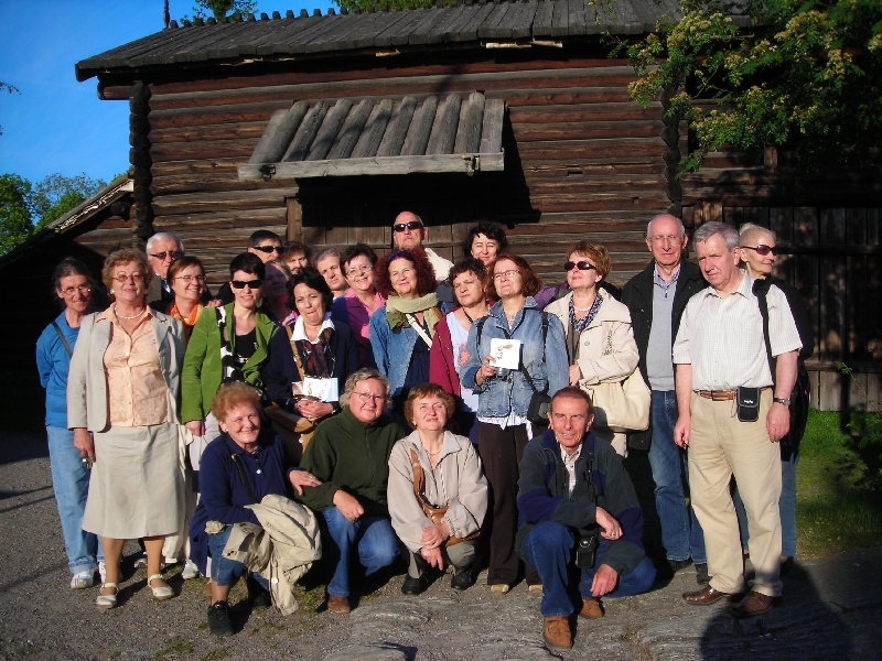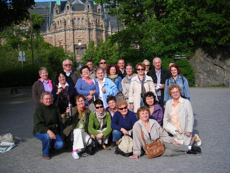 W dniu 2 czerwca br. zwarci i gotowi stawiliśmy się wszyscy na lotnisku, w sile 30 osób na czele z prezes Elżbietą Chojecką i dyrygentką Zuzanną Kuźniak, punktualnie o godzinie 6.00 rano. Wylecieliśmy z Warszawy z piętnastominutowym opóźnieniem o godzinie 8.15. Z lotu ptaka podziwialiśmy piękne widoki najpierw Polski, potem Bałtyku i Szwecji. Z lotniska Arlanda w Sztokholmie przejechaliśmy zamówionym autobusem na Dworzec Centralny, gdzie czekała na nas mieszkająca w stolicy Szwecji Maria, zwana Malinką, siostra cioteczna naszej koleżanki Ewy Zielińskiej. Malinka wraz z mężem pojechali z nami metrem i doprowadzili do zarezerwowanego dla nas hotelu na statku. Zasapaliśmy się nieco targając walizki przez jakieś pół godziny. Ponieważ doba hotelowa zaczynała się dopiero od godziny 14.00, zostawiliśmy bagaże w przechowalni na statku, po czym dalej pilotowani przez Malinkę i jej męża doszliśmy do wegetariańskiej restauracji, gdzie spożyliśmy dość oryginalne, wschodnie dania. Następnie wróciliśmy do hotelu (wszystko na piechotę), gdzie zakwaterowaliśmy się w maleńkich, ciasnych kajutach z wąskimi podwójnymi lub piętrowymi łóżkami. Nie było tam żadnych półek, ani nawet jednego krzesła, żeby się rozpakować.