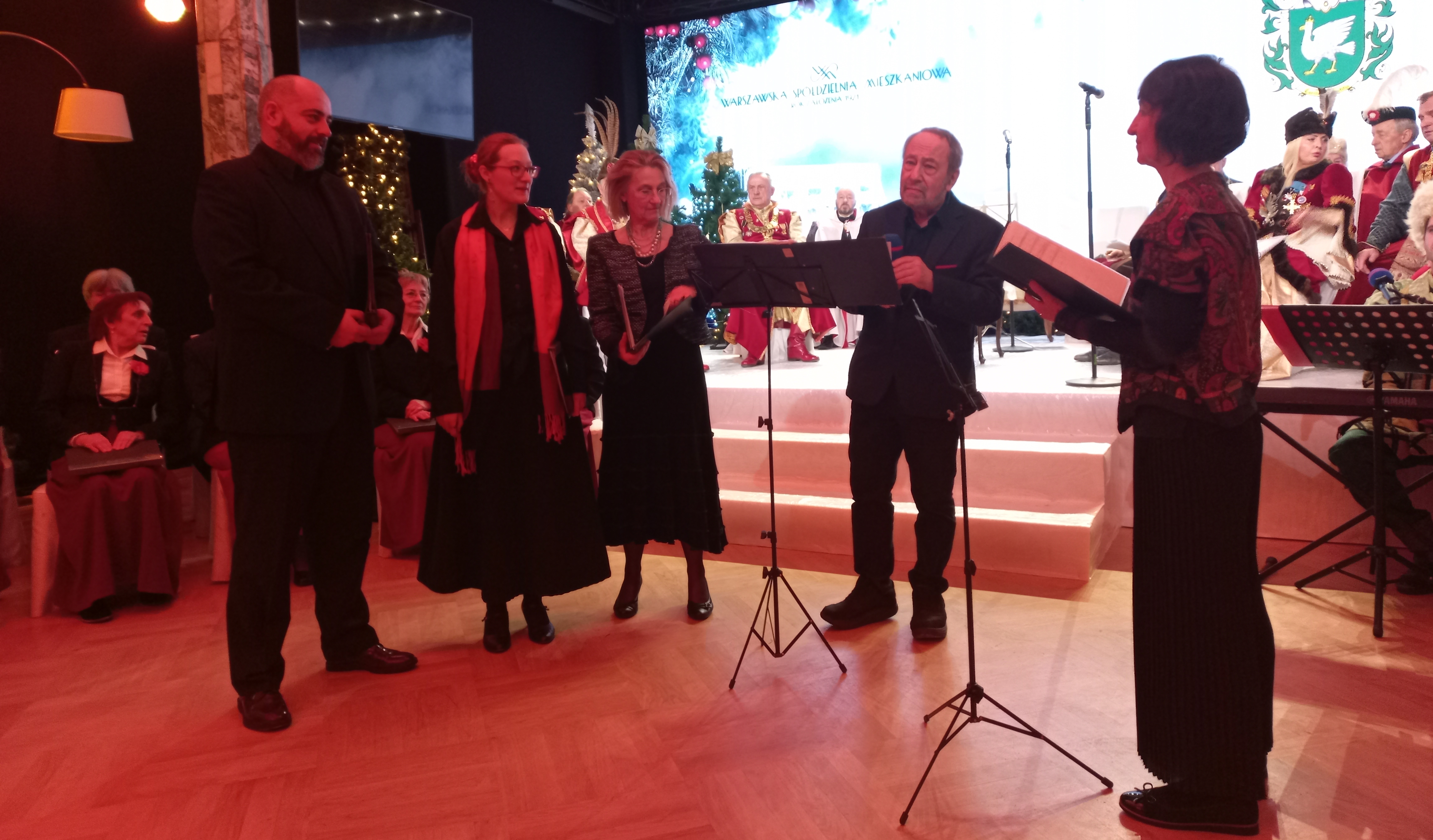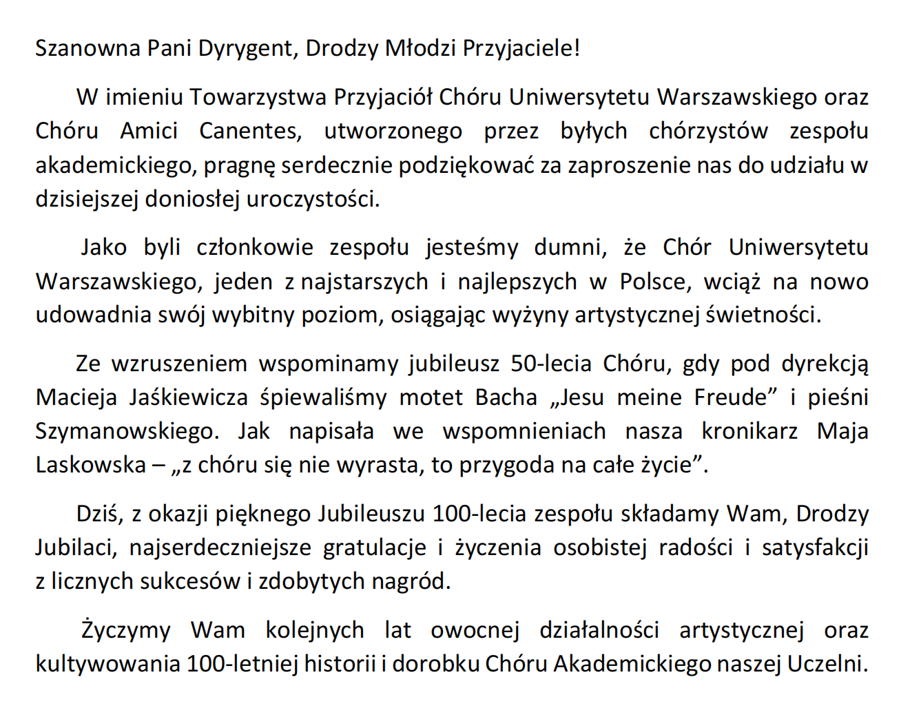 Dyrygent Agnieszka Zińczuk złożyła życzenia noworoczne przybyłym gościom i chórzystom, podsumowując bogaty w wydarzenia artystyczne rok 2023 w chórze. Prezes Jolanta Sikorska-Lis podziękowała Zespołowi TPChUW ds. Jubileuszu 100-lecia Chóru UW za realizację licznych jubileuszowych zadań. Maria Laskowska w imieniu ww. Zespołu przekazała słowa podziękowania dla dyrygent Iriny Bogdanovich i Krzysztofa Rostowskiego za miłą współpracę przy organizacji jubileuszowych uroczystości. O swoich muzycznych przeżyciach z Chórem UW opowiedziała ze wzruszeniem dyrygent Irina Bogdanovich, podkreślając znaczenie ciągłości chórowej tradycji i sztafety pokoleń. Swoją obecnością na spotkaniu zaszczycił nas również Tomasz Kwieciński – prezes Towarzystwa Polsko-Szwedzkiego.