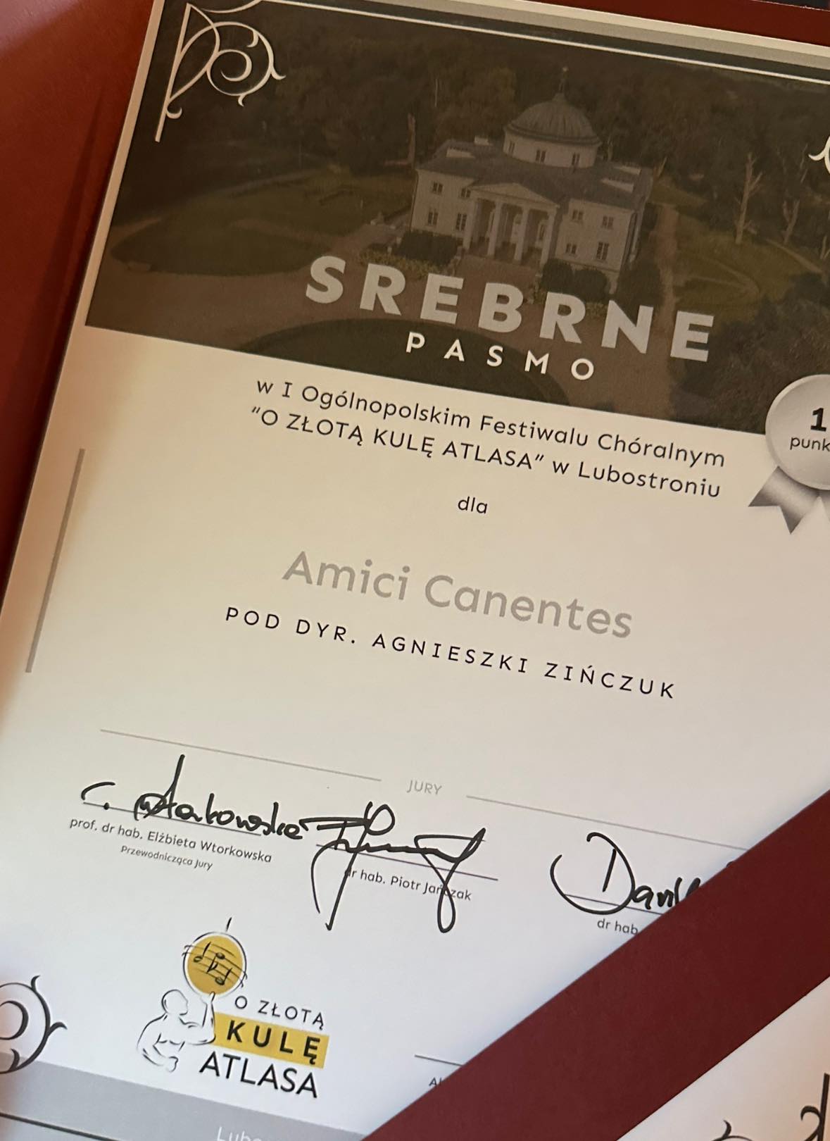 6 lipca 2024 Chór Amici Canentes wziął udział w festiwalu chóralnym „O złotą kulę Atlasa” w Lubostroniu, w woj. kujawsko-pomorskim. Wykonaliśmy „Parce Domine” F. Nowowiejskiego, „A Clare Benediction” J. Ruttera, „Zosię” St. Niewiadomskiego i St. Wiechowicza oraz „Oj nasi jadą” w opracowaniu S. Rożdżyńskiego.
