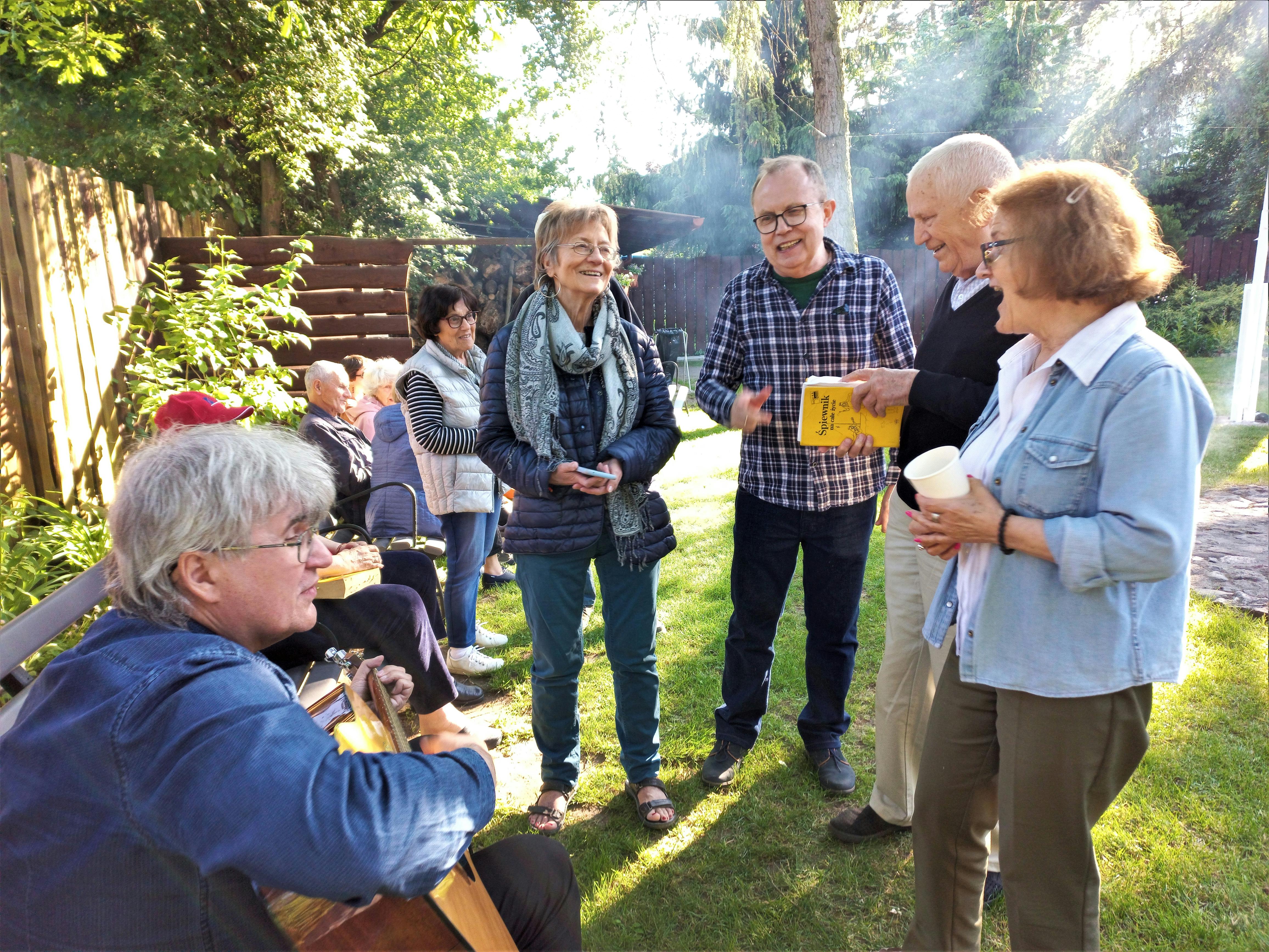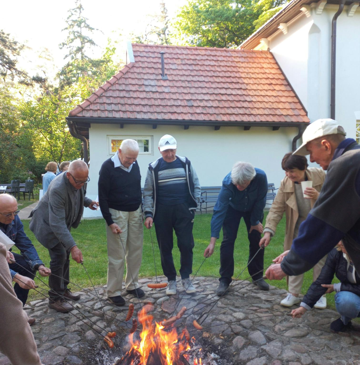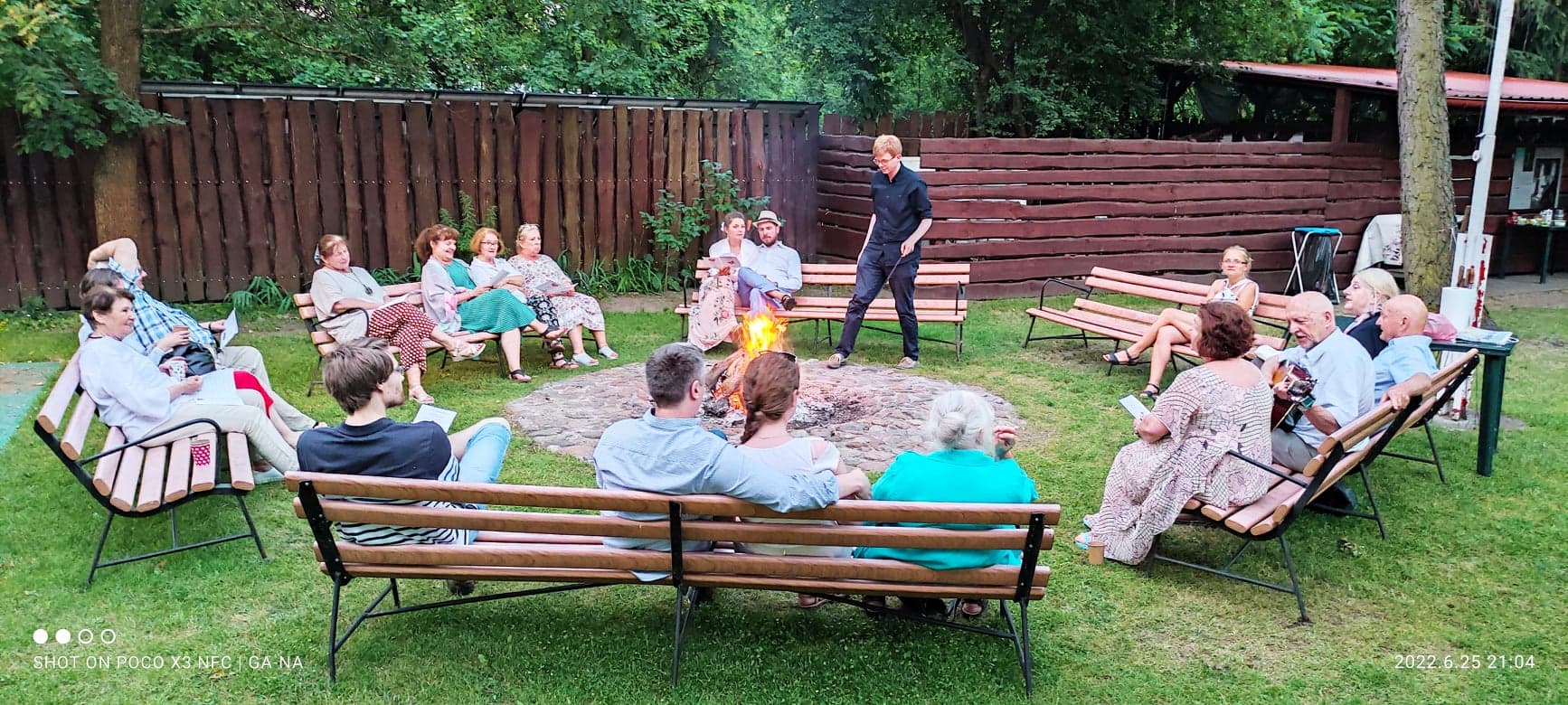Biesiadnicy wpisali się do Księgi Pamiątkowej Zagrody, zaśpiewali toast dla Leszka solenizanta, po czym rozpoczęli śpiewy zbiorowe i przeboje solistów przy akompaniamencie gitar (a gitarzystów przybyło kilku). Okazało się, że nasza dyrygent Agnieszka zna wiele wspólnych rozrywkowych utworów i lubi je z nami śpiewać, co nas bardzo cieszy. Niezawodnym punktem programu było pieczenie kiełbasek na ognisku. Dziękujemy naszym Koleżankom – Joli, Marysi i Eli – za zorganizowanie pikniku.