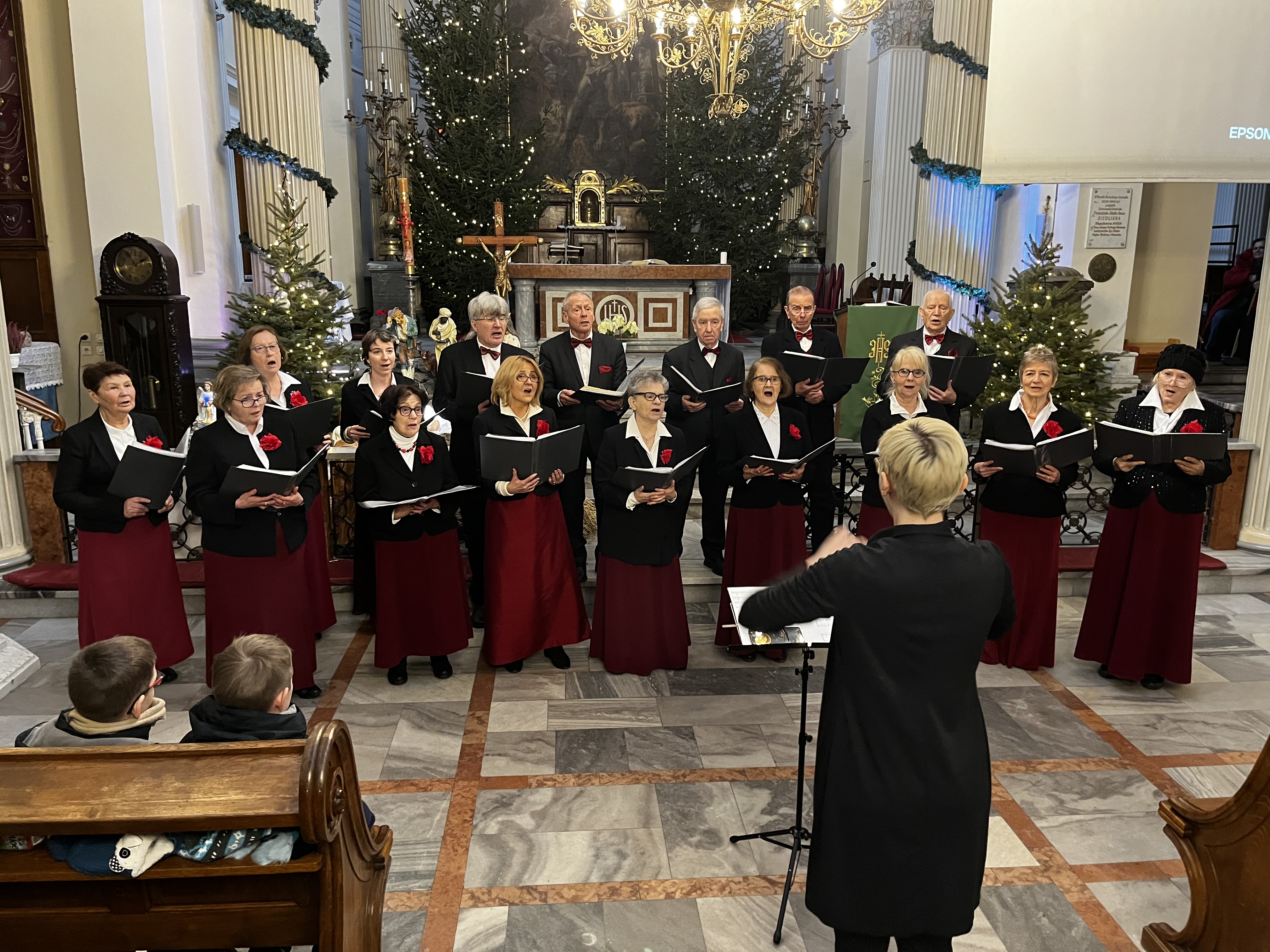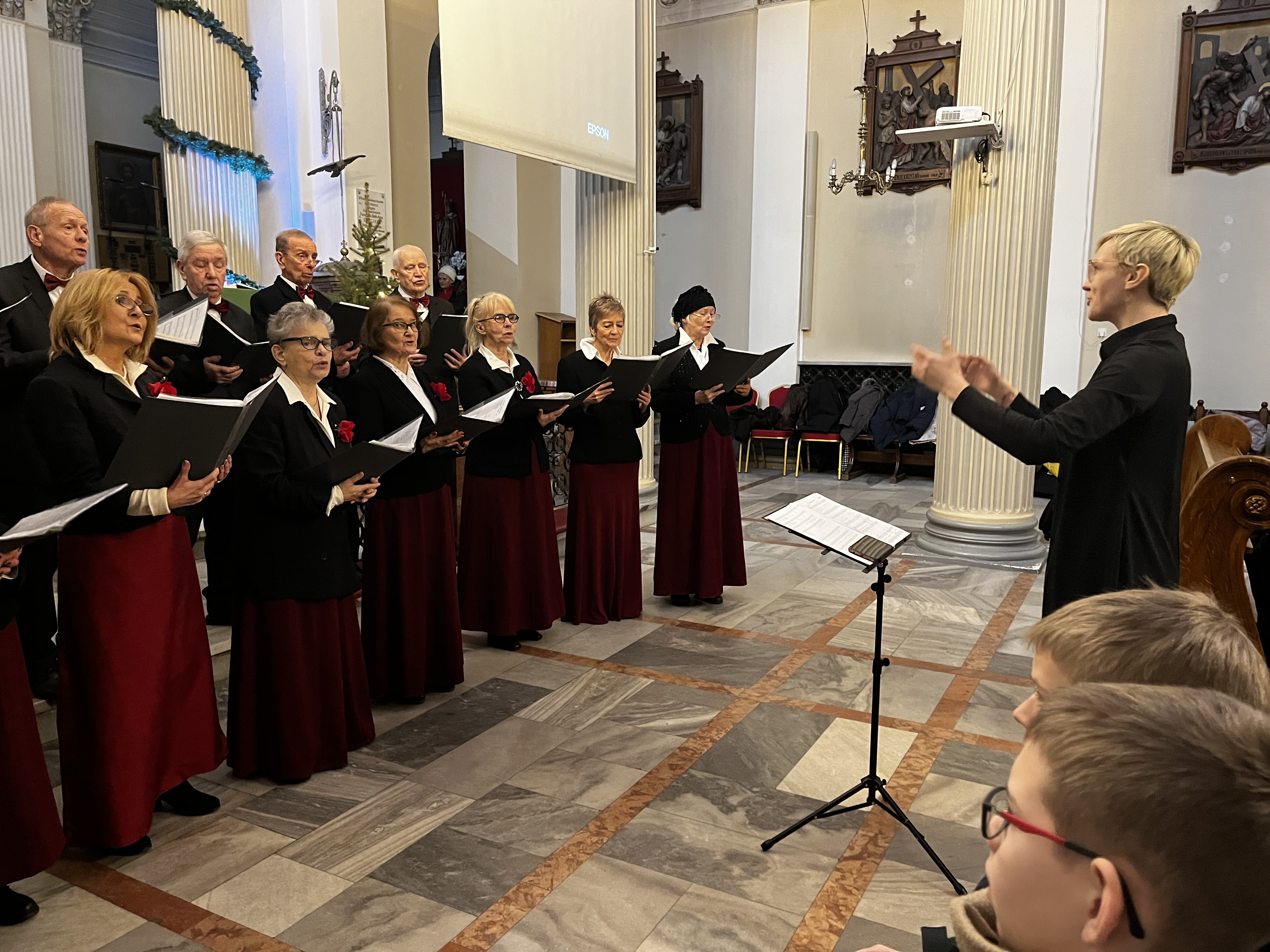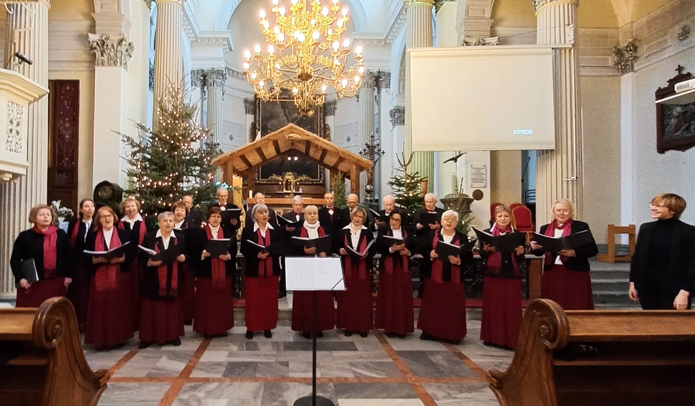 Tradycyjne polskie kolędy nasz Chór zaśpiewał w Kościele św. Aleksandra przy placu Trzech Krzyży podczas niedzielnej Mszy św. dla niesłyszących, 30.01.2022. Mszę odprawiał, posługując się językiem migowym, Ks. Dariusz Furmanik, duszpasterz archidiecezjalny osób głuchych. Treść kolęd objaśniali tłumacze migowi. Po Mszy serdeczne życzenia noworoczne złożyła uczestnikom Dyrygent Ilina Sawicka. Ks. Dariusz Furmanik obdarował Chórzystów ciekawą publikacją „Głusi mówią”, opowiedział nam też o założycielu Instytutu Głuchoniemych (w 1817 r.), Ks. Jakubie Falkowskim, pierwszym proboszczu tej parafii, którego pomnik znajduje się w Kościele św. Aleksandra.