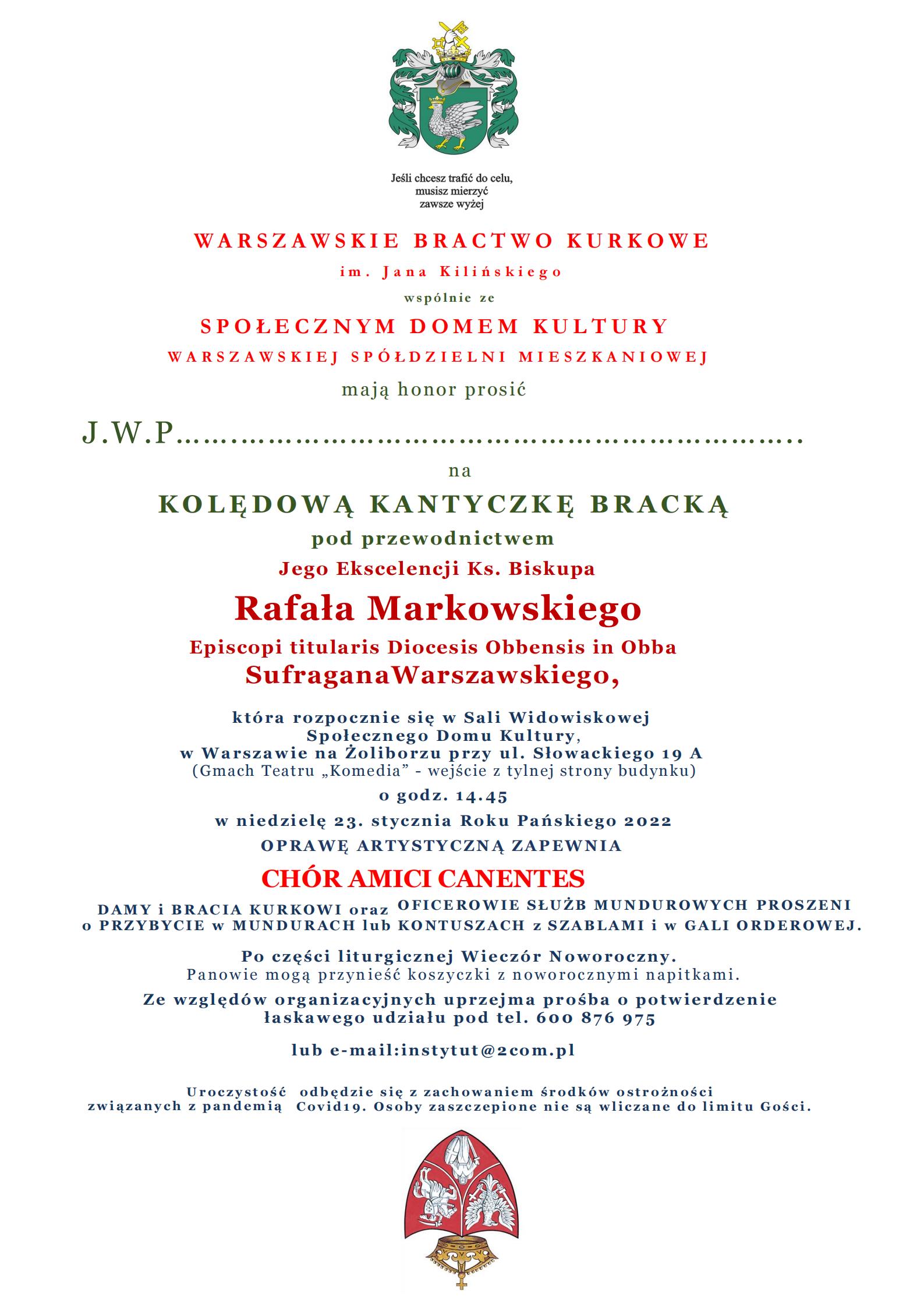 Chór Amici Canentes wziął udział w Kolędowej kantyczce brackiej pod przewodnictwem Ks. Biskupa Rafała Markowskiego, 23.01.2022 w gmachu Teatru Komedia. Damy i bracia kurkowi przybyli w kontuszach, z szablami i w gali orderowej.