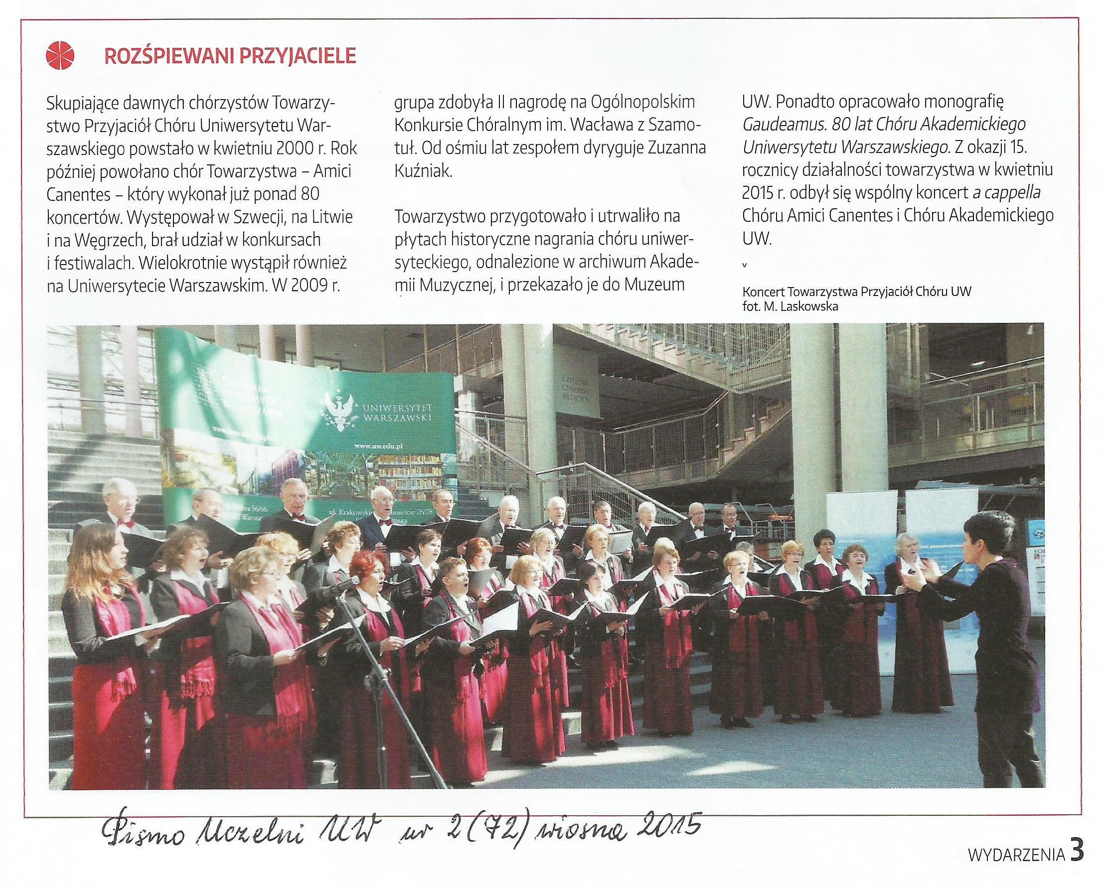 Chór Amici Canentes TPChUW, obchodzący w tym roku piętnastolecie działalności, wystąpił 10 kwietnia br. pod dyr. Iliny Sawickiej z jubileuszowym koncertem, który odbył się w sali koncertowej Uniwersytetu Muzycznego Fryderyka Chopina w Warszawie. Licznie przybyłych gości powitała prezes TPChUW Elżbieta Chojecka.