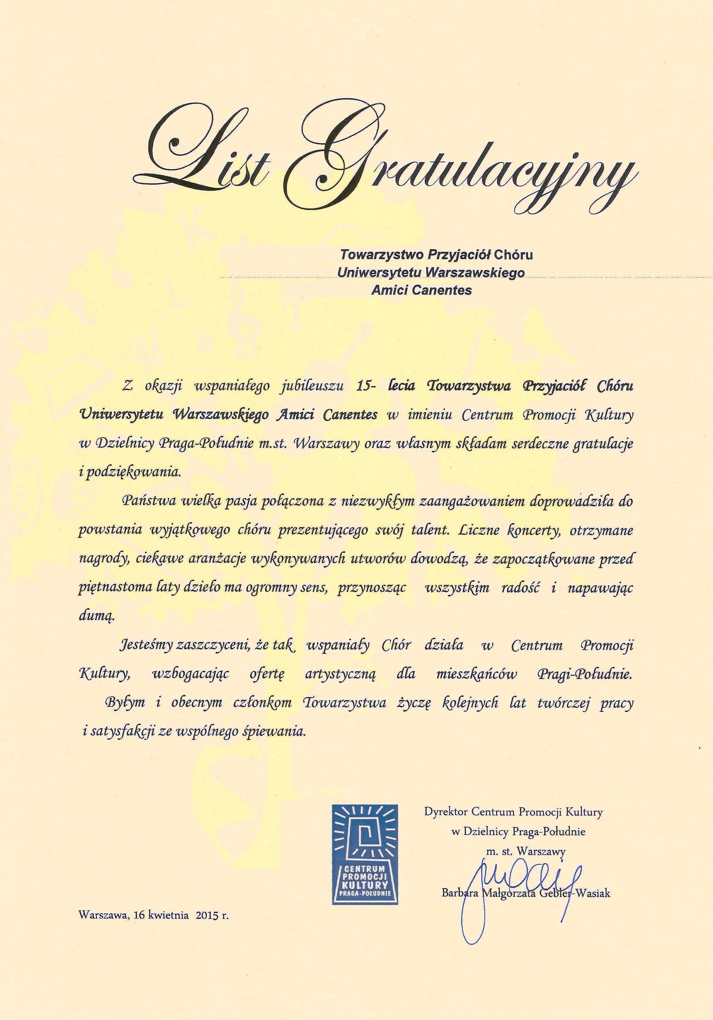 Był to koncert jubileuszowy, z okazji 15 lat działalności Towarzystwa, w wykonaniu Chóru Amici Canentes i Chóru Akademickiego UW, zakończony serdecznymi gratulacjami dla Jubilatów, "Vivatem" i wspólnym wykonaniem "Maków" z młodymi chórzystami. Koncert prowadziła Marysia Bychawska. Przybyli liczni członkowie Towarzystwa, w tym niektórzy członkowie-założyciele, z pierwszą prezes Olimpią Zaborską. Zamieszczamy listy gratulacyjne, otrzymane z okazji Jubileuszu Towarzysta od Chóru Akademickiego UW oraz od Dyrekcji Centrum Promocji Kultury Praga-Południe.