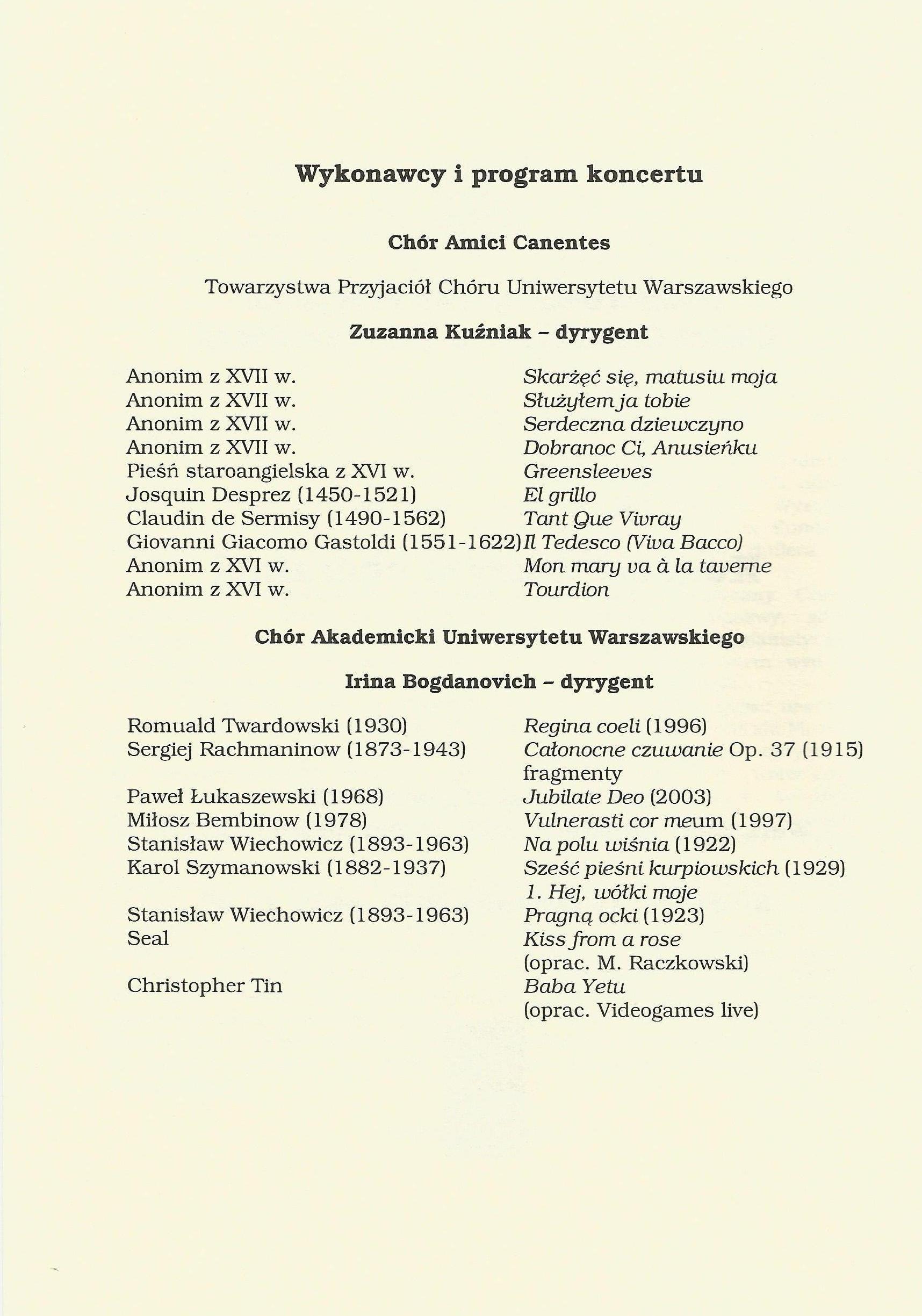 Program koncertu dzielił się na trzy części: pieśni religijne polskie, pieśni religijne obce oraz świeckie pieśni i madrygały.