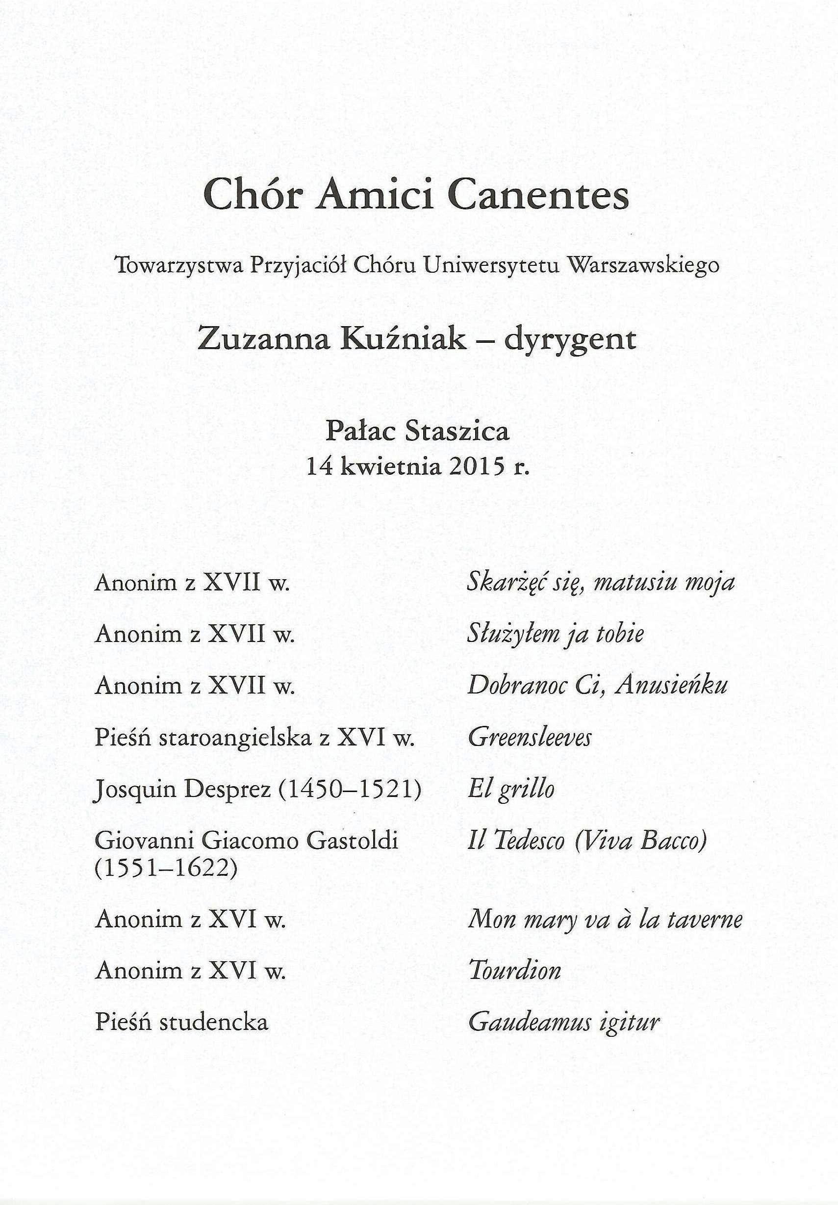Nasz Chór wystąpił 15 kwietnia br. z dorocznym wiosennym koncertem w Uniwersytecie Muzycznym Fryderyka Chopina, na który przybyło dość liczne grono członków i sympatyków Towarzystwa. Tym razem Chór zaprezentował repertuar świecki, od utworów XVI-wiecznych kompozytorów do współczesności. W programie znalazły się utwory G. Gastoldiego, T. Morleya, J. Arcadelta, Juana del Enciny, Orlanda di Lasso, P. Passereau, M. Aslund oraz kompozytorów anonimowych. Zapowiadała Maria Bychawska.