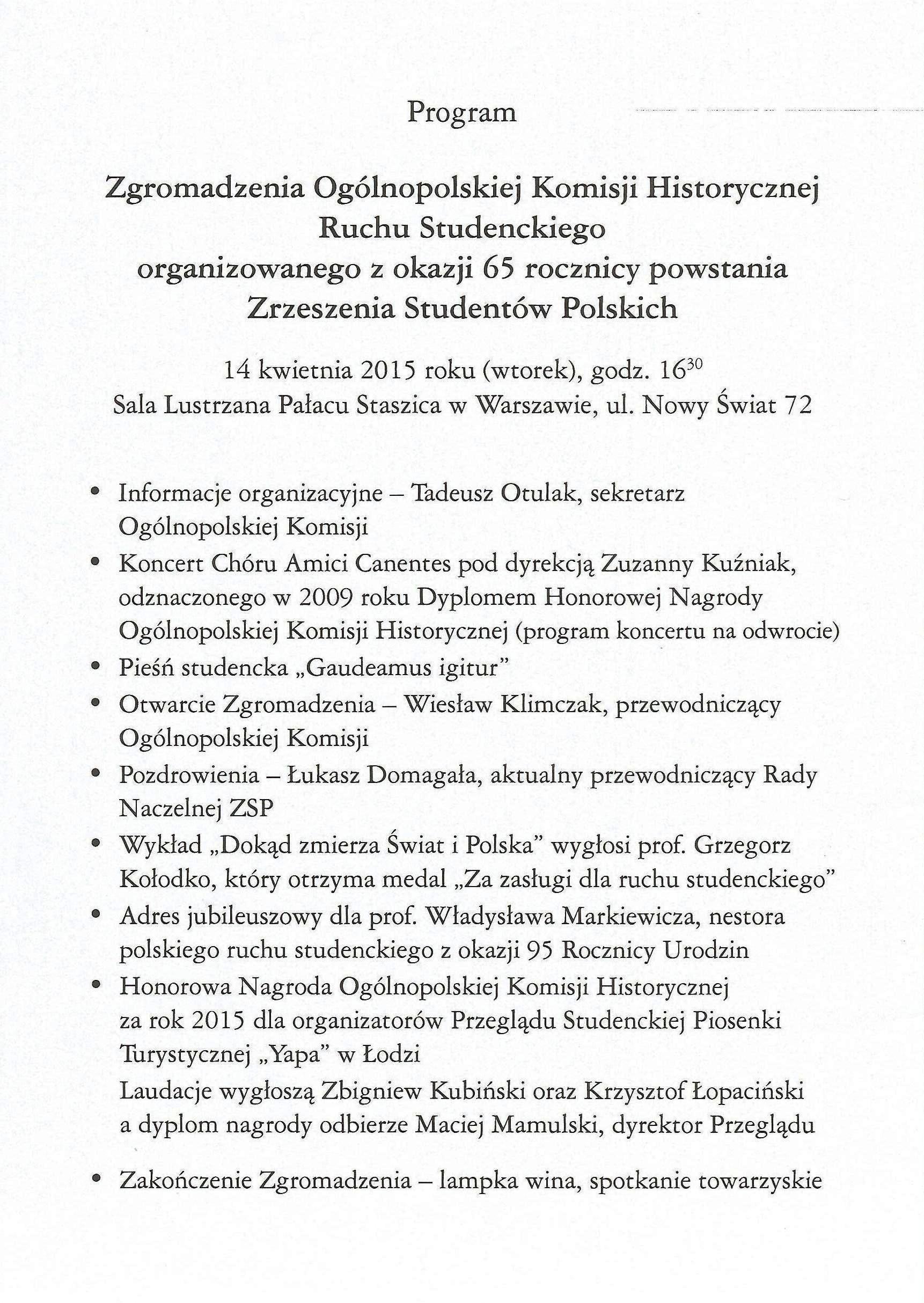 Koncert w Pałacu Staszica podczas Zgromadzenia Ogólnopolskiej Komisji Historycznej Ruchu Studenckiego, z okazji 65 rocznicy powstania ZSP – 14 kwietnia 2015