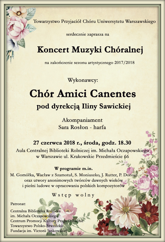 Tegoroczny koncert zespołu "Amici Canentes" pod dyrekcją Iliny Sawickiej odbył się w sali koncertowej UM Fryderyka Chopina w Warszawie. Do wspólnego śpiewania zostali zaproszeni goście - grupa wokalna L'Estro Cantando pod dyrekcją Doroty Krzemińskiej. Zebraną licznie publiczność powitała prezes TPChUW Elżbieta Chojecka. Koncert zapowiadała Maria Laskowska, przed częścią trzecią koncertu wystąpiła również z zapowiedzią dyrygent Ilina Sawicka. Program koncertu składał się z trzech części. W pierwszej części wystąpił chór "Amici Canentes". Wykonał cztery utwory o charakterze sakralnym . Głównym punktem tego fragmentu koncertu była "Msza" Mariana Sawy składająca się z czterech części.W drugiej części koncertu wystąpili zaproszeni goście. Wykonali sześć utworów o bardzo zróżnicowanym charakterze , zarówno dawnych jak i współczesnych, z kręgu muzyki angielskiej , niemieckiej i polskiej. Pierwsze trzy utwory zostały wykonane z towarzyszeniem młodych , ale znakomitych instrumentalistów : podwójne skrzypce, wiolonczela , klawesyn. W trzeciej części koncertu wystąpił ponownie chór "Amici Canentes" , tym razem z repertuarem o charakterze folklorystycznym . Z tej okazji członkinie zespołu założyły kolorowe , ludowe chusty i korale. Zespół wykonał sześć utworów : trzy pieśni ludowe , pieśń F. Chopina "Życzenie" oraz Kołysankę " do słów K. I. Gałczyńskiego. Występ obu chórów zakończyło wspólne wykonanie żartobliwego utworu pt. "Chóry" z muzyką W. Steca do słów A. Andrusa. Tegoroczny koncert został bardzo życzliwie przyjęty przez publiczność . Z przyjemnością słuchaliśmy miłych opinii , że koncert był urozmaicony i udany.