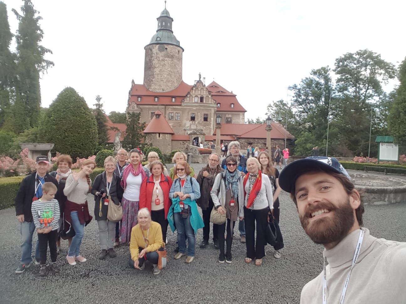 Byliśmy także w Czechach. Zwiedziliśmy kilka miejsc, nie zważając na siąpiący deszcz. Fotografowaliśmy się pod lwami w Hejnicach, nim zwiedziliśmy pobliską Bazylikę z cudowną figurką Maryi. Wcześniej po drodze oglądaliśmy największą beczkę w Europie, w której mieścił się sporawy zajazd. Najciekawszy obiekt, zamek we Frydlancie powitał nas rzęsistym deszczem i czekając przed wejściem, ja przynajmniej wyobraziłam sobie, co czuł filmowy Jurand stojąc u bram Zamku Krzyżackiego w Szczytnie. Lecz wnętrze zamku pełne wspaniałych obrazów i sprzętów wynagrodziło oczekiwanie. W kaplicy odśpiewaliśmy „Alleluja, chwalcie Pana...”, wprowadzając w osłupienie i podziw czeskiego przewodnika świetnie władającego językiem polskim. W kolejnym mieście, Libercu, zwiedziliśmy nieduży, lecz znakomicie urządzony ogród botaniczny oraz staromiejski Rynek z bogatym, eklektycznym Ratuszem.