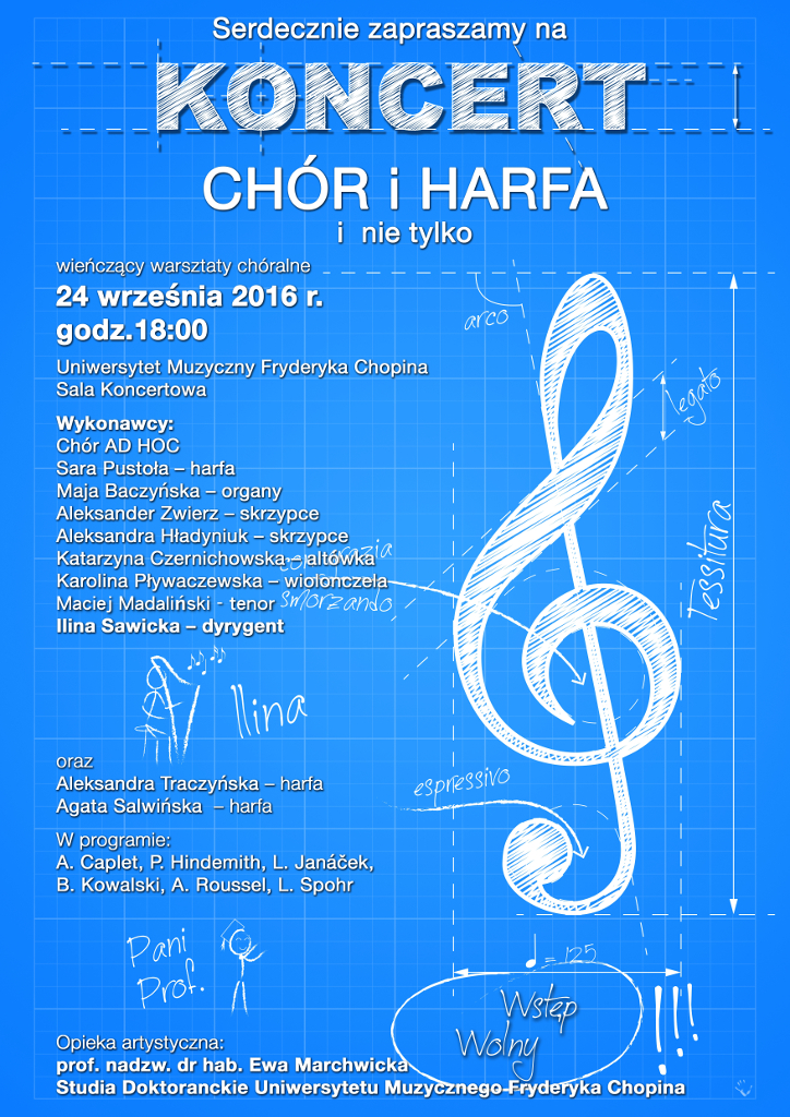 W ramach studiów doktoranckich Uniwersytetu Muzycznego Fryderyka Chopina w Warszawie we wrześniu br., podobnie jak rok temu, zostały zorganizowane warsztaty muzyczne objęte merytoryczną opieką prof. Ewy Marchwickiej. Do udziału w nich zaproszono osoby śpiewające, gotowe na przeżycie ciekawej przygody chóralnej. Uczestnicy projektu przez osiem dni obcowania z wybranym repertuarem na chór mieszany i harfę stworzyli – pod kierunkiem profesjonalistów – eksperymentalny chór AD HOC, który na zakończenie warsztatów wykonał koncert finałowy pod dyr. Iliny Sawickiej. W programie znalazły się m.in. utwory Leoša Janáčka, Paula Hindemitha oraz obecnego na sali Bartosza Kowalskiego, który specjalnie na tę okazję skomponował jeden z wykonanych przez zespół utworów. Na harfie grały Sara Pustoła, Aleksandra Traczyńska i Agata Salwińska, na organach – Maja Baczyńska. Występy wzbogacił udział solistów i kwartetu smyczkowego.